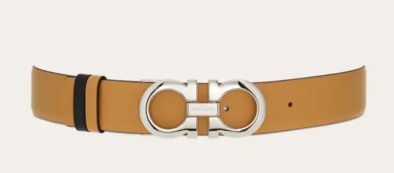 With its streamlined silhouette and signature details, this belt is a timeless wardrobe staple. The sophisticated two-tone design is crafted from calfskin leather and adorned with the unmissable Gancini buckle – rendered here in a palladium hue. The adjustable length allows for a more personalized fit and style. We invite you to check our size guide for more information.