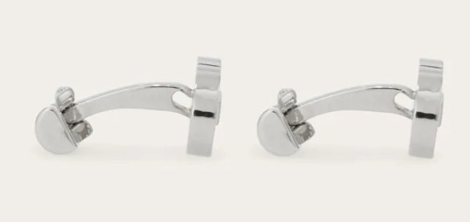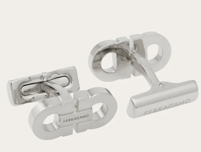 Back to back Gancini bits form the outline of these cool new cufflinks by Ferragamo. The brushed finish implies an industrial feel, with embossed logo on the central link.
