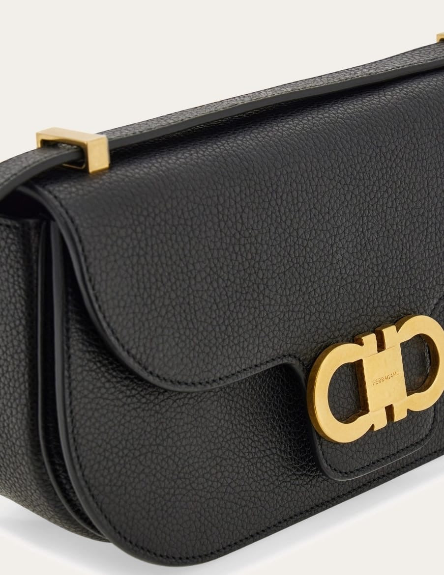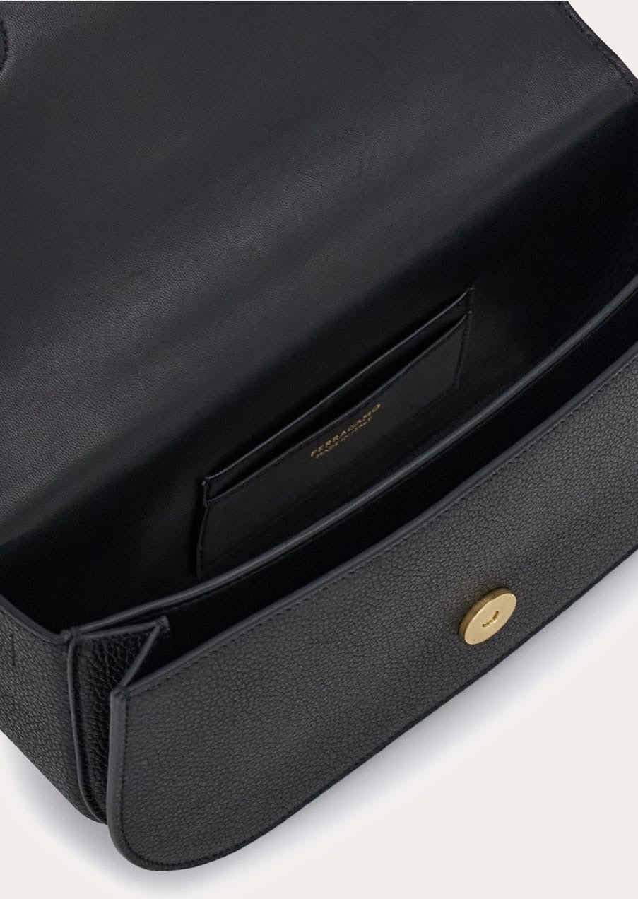 A ladylike silhouette with a contemporary attitude, the eat-west edition of the Ferragamo cross body is both practical and chic. Cut from hammered calfskin leather, it features a curved front flap that fastens at the front via a golden Gancini clasp. A slit pocket on the back and well organized interior provide ample space for personal effects. A metallic chain and leather cross body strap offer versatile styling options.