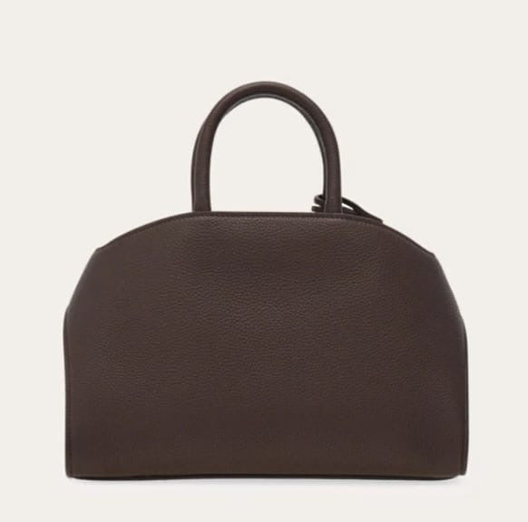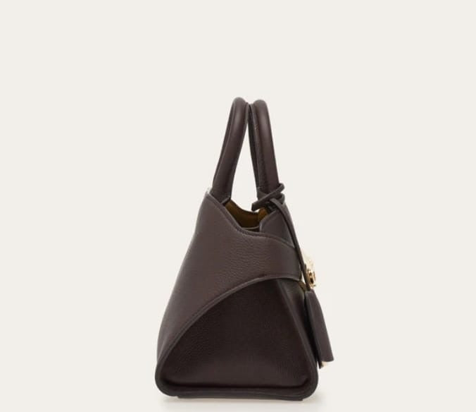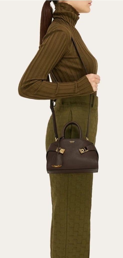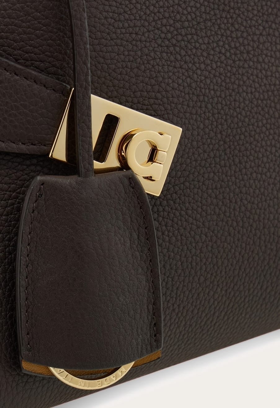 Two-tone iteration of the Ferragamo Hug bag, a new contemporary icon made of hammered calfskin, vegetable dyed and tumbled for a rich, pebbled finish. The silhouette features an asymmetrical back panel that wraps around to ‘hug’ the front one via two wide leather straps with custom golden Gancini clasps. It fastens on the inside with a metallic ring, the lined interior features a zip pocket, and a tonal leather fob is placed on the rigid top handle.