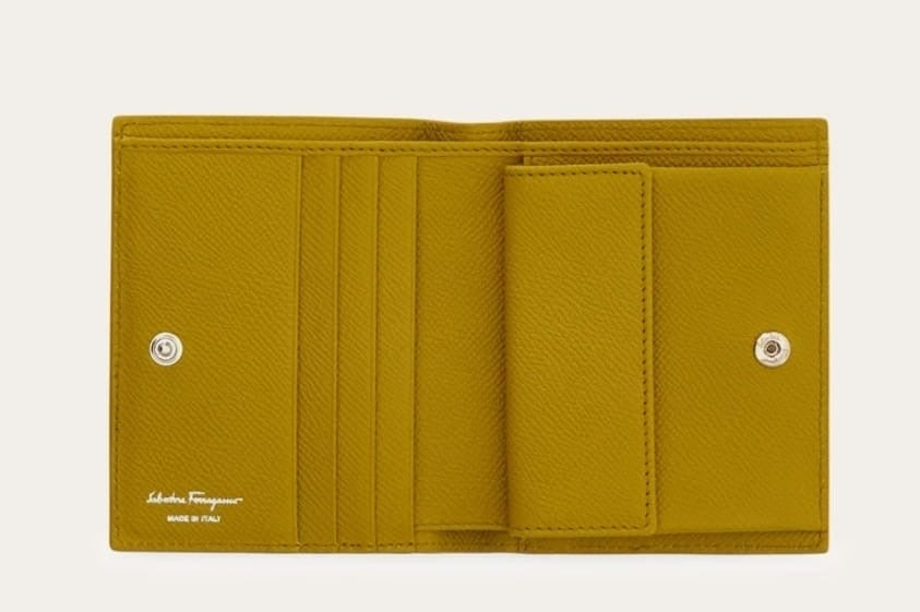 Cool interpretation of the compact wallet, with external dials in calfskin printed with a multicolored Gancini pattern. The interior is functionally organized to hold banknotes, cards and coins thanks to the flat compartments and pocket with button. The timeless Gancini in palladium finish graces the front.