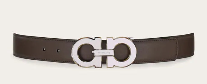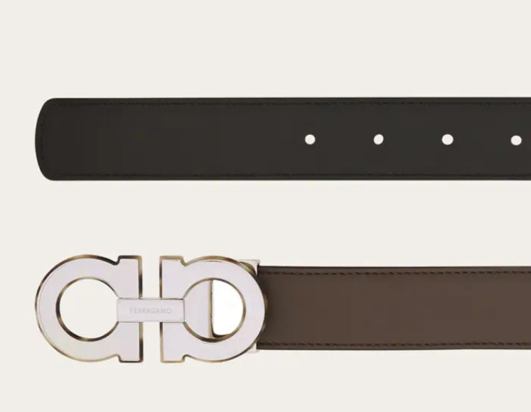 A modern update to the classic Ferragamo belt, featuring contrast stitching for a relaxed feel and a reversible two-tone design for ultimate versatility. The palladium-finish Gancini buckle is accented with a resin border in a tortoiseshell effect, adding a refined touch. The adjustable length allows for a more personalized fit and style. We invite you to check our size guide for more information.