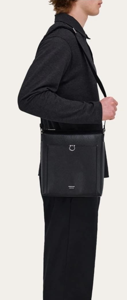 A sophisticated texture with geometric lines and Gancini detailing adorn the jacquard fabric of this new crossbody bag. Versatile with an urban vibe, it is complemented by tonal calfskin details that reinforce the front pocket, opening and trims. The painted metal zip fastening reveals an interior, complemented by a zipped pocket that allows you to organize your personal items perfectly. Adjustable technical tape shoulder strap so you can carry it over the shoulder or cross body.