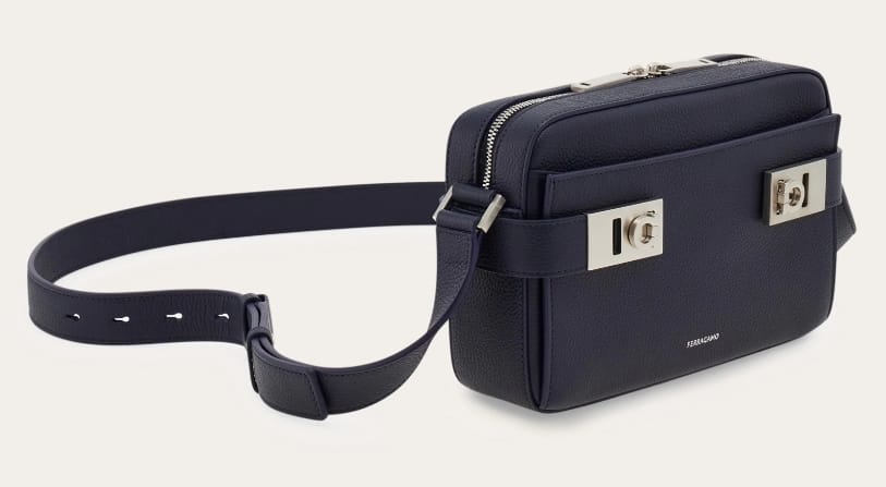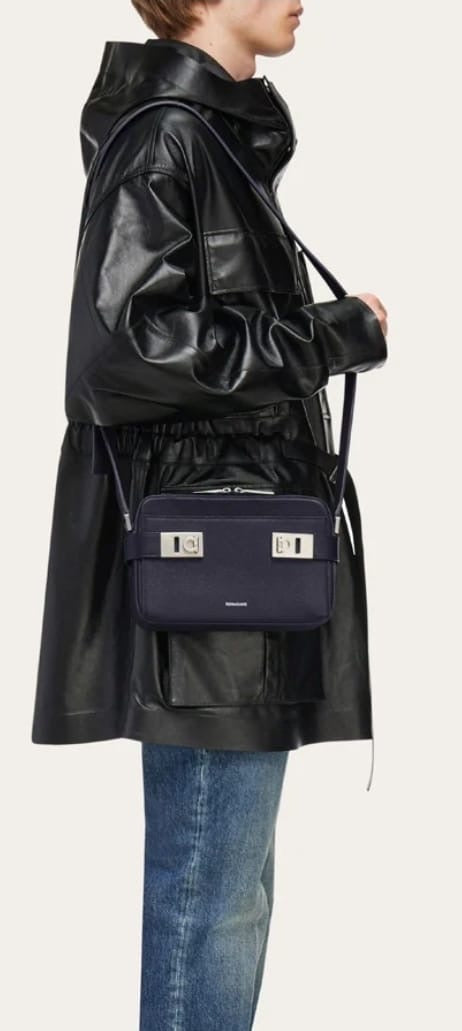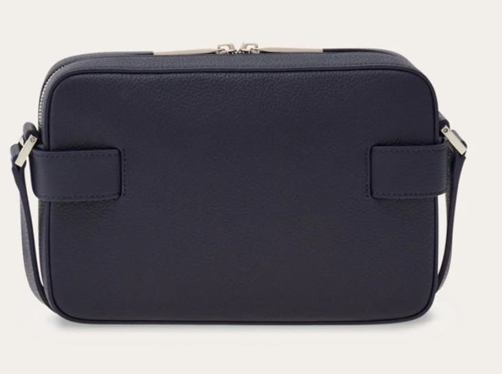 Compact cross body bag made of hammered calf leather with a soft, rich finish. The boxy shape features leather tabs on each side with Gancio buckles that open the front flat pocket. The top zip opens to a fabric lined interior with zip pocket. Adjustable leather strap.
