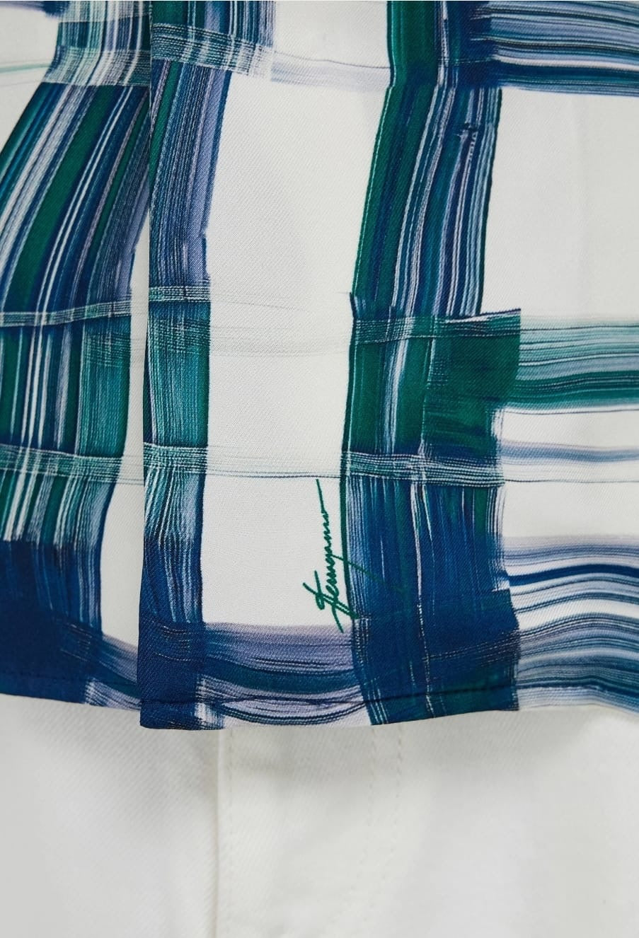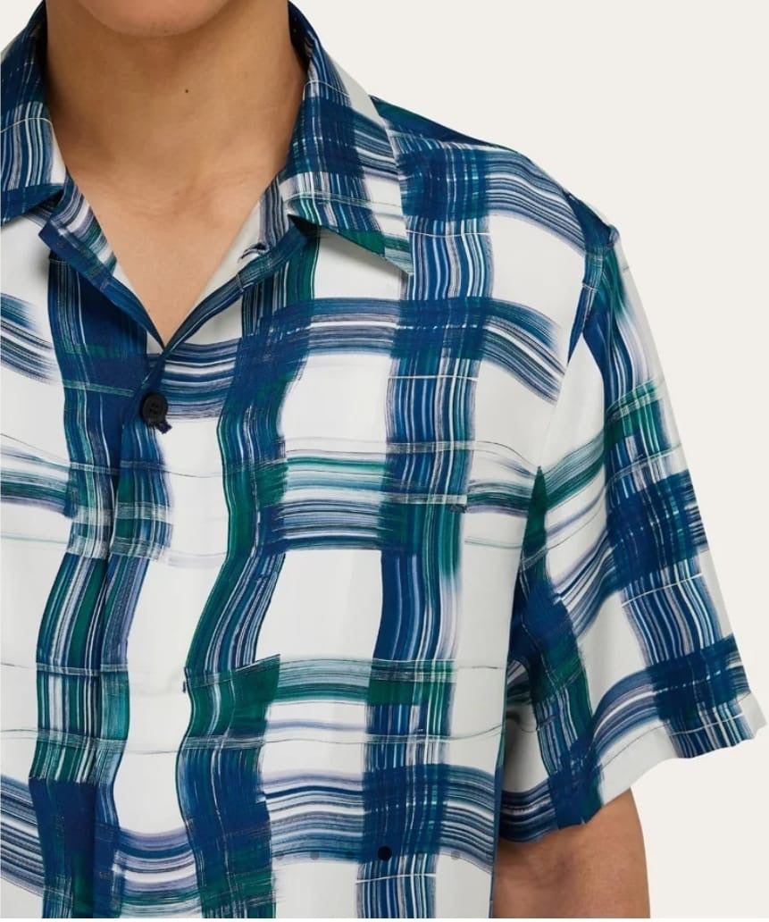 Precious materials and a classic sports silhouette give this bowling-inspired shirt a directional appeal. Featuring a maxi tartan motif made up of freestyle brush strokes, the cut is regular, with a hidden placket that reveals the top two buttons.