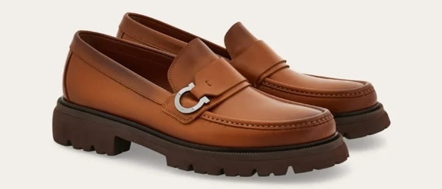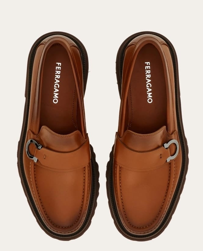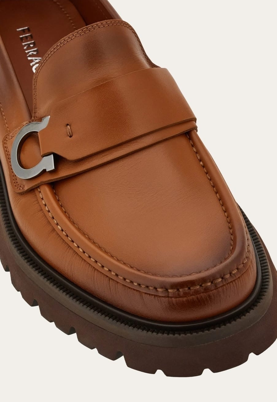 Loafers with a metropolitan feel, featuring a bold rubber sole and a track sole. The upper is crafted from aged calfskin, hand-stained and faded. The style is completed with visible stitching on the plastron and a Gancini trim on the side in a ruthenium finish. Flexible and lightweight, the Tubolare construction involves several stages of manufacturing and hand-stitching.