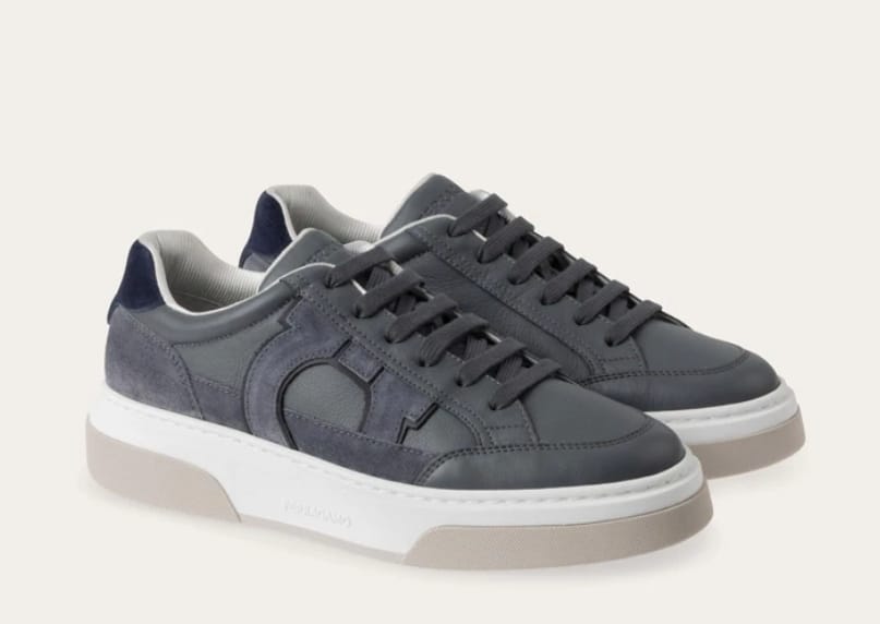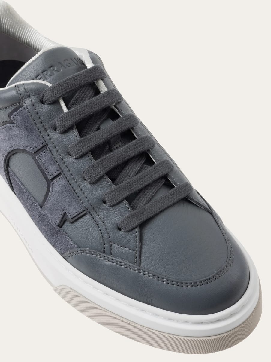 Low-top leather sneaker with suede details, inspired by 90s basketball shoes. Notice the signature Gancini motif with a 3D inlay effect on the side. Rubber sole with textured edges and custom tread.