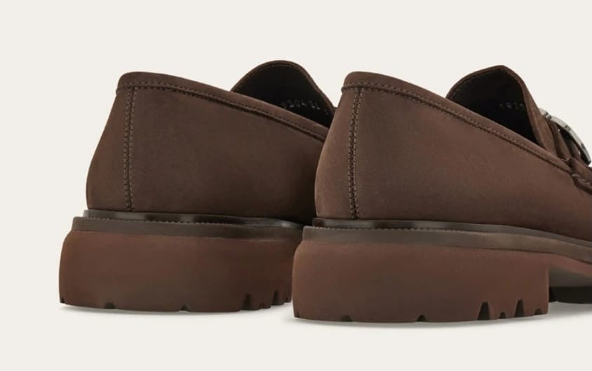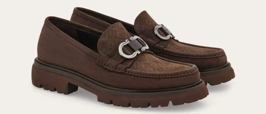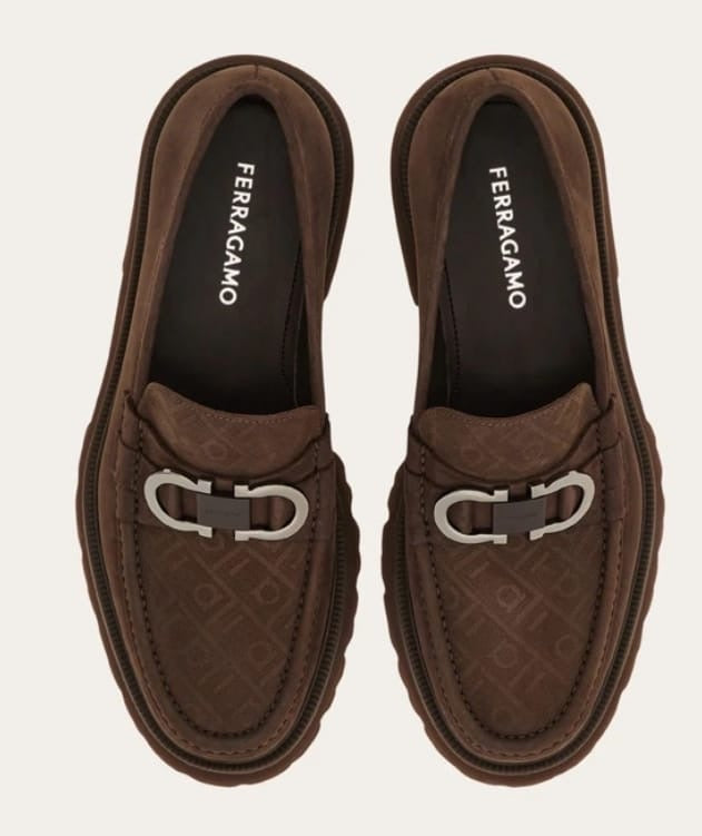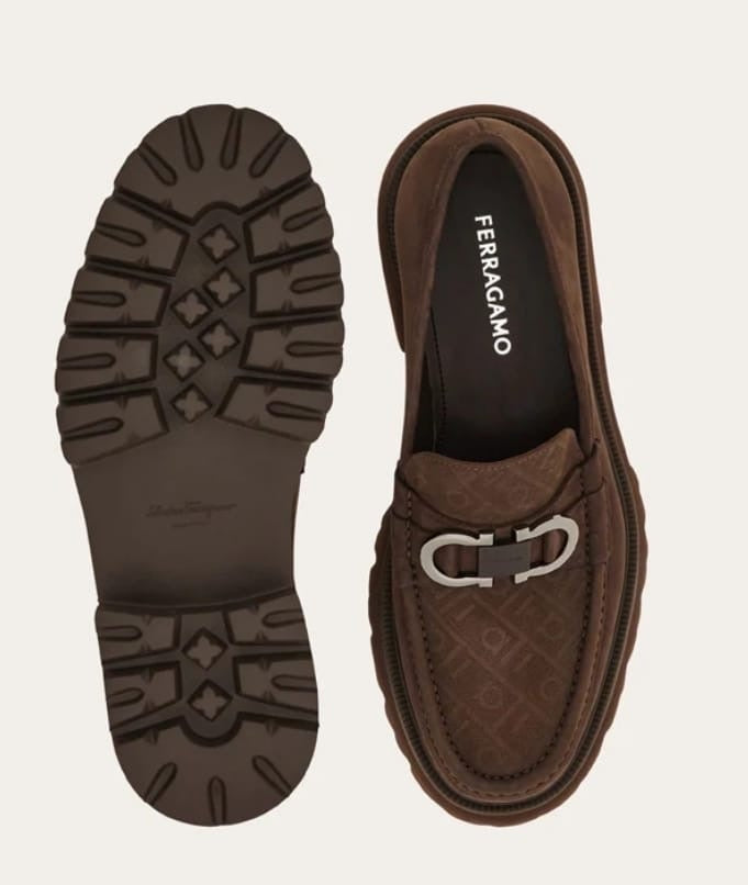City elegance: this loafer combines the Ferragamo Monogram with perforated detailing adorning the apron toe. Notice the Gancini motif in a burnished finish, enriched with a contrasting lacquered plaque, and a chunky rubber-lug sole – lightweight enough to wear all day. The tubular construction method, which involves meticulous hand-stitching and assembly, ensures a flexible and lightweight silhouette.