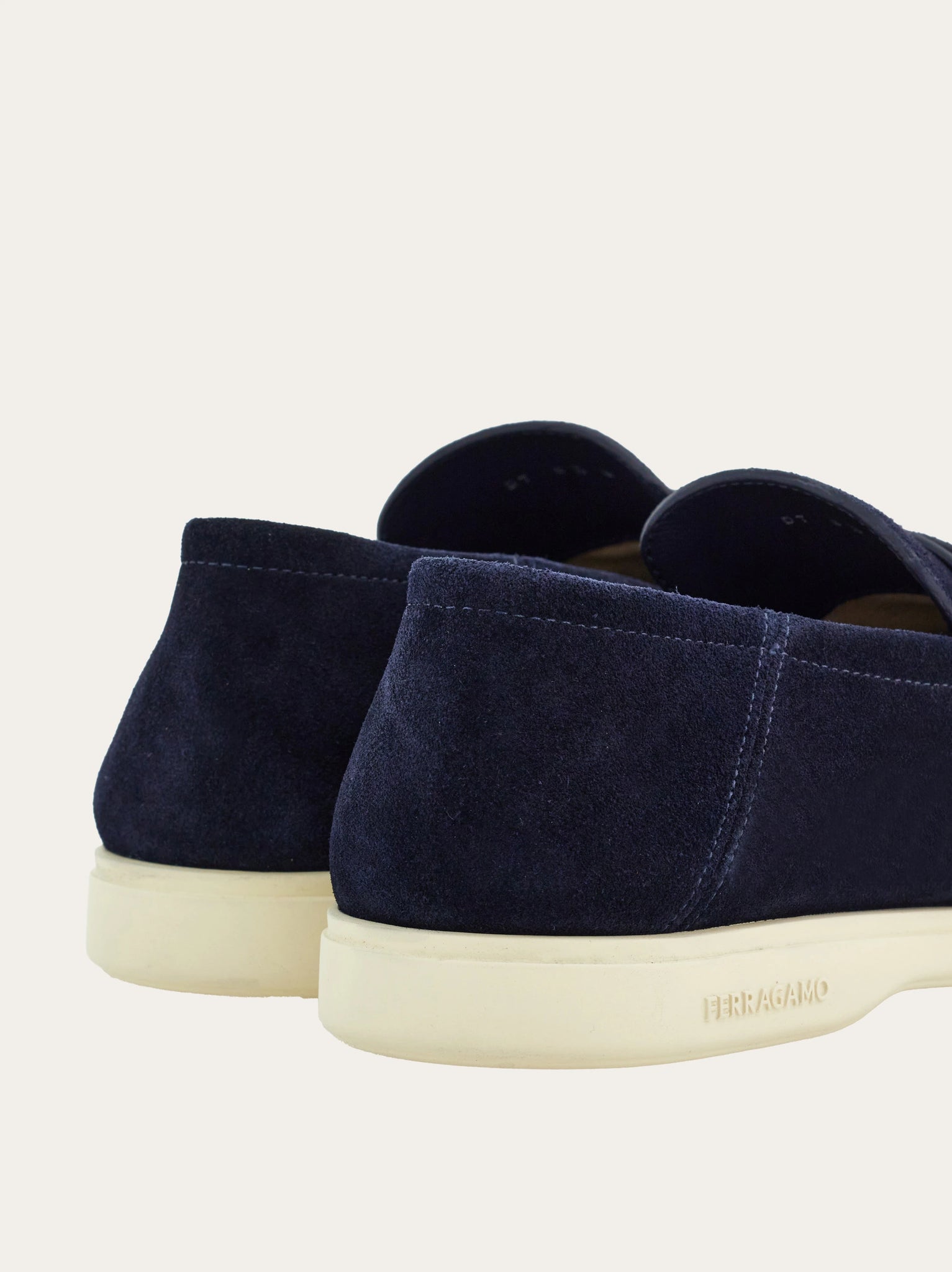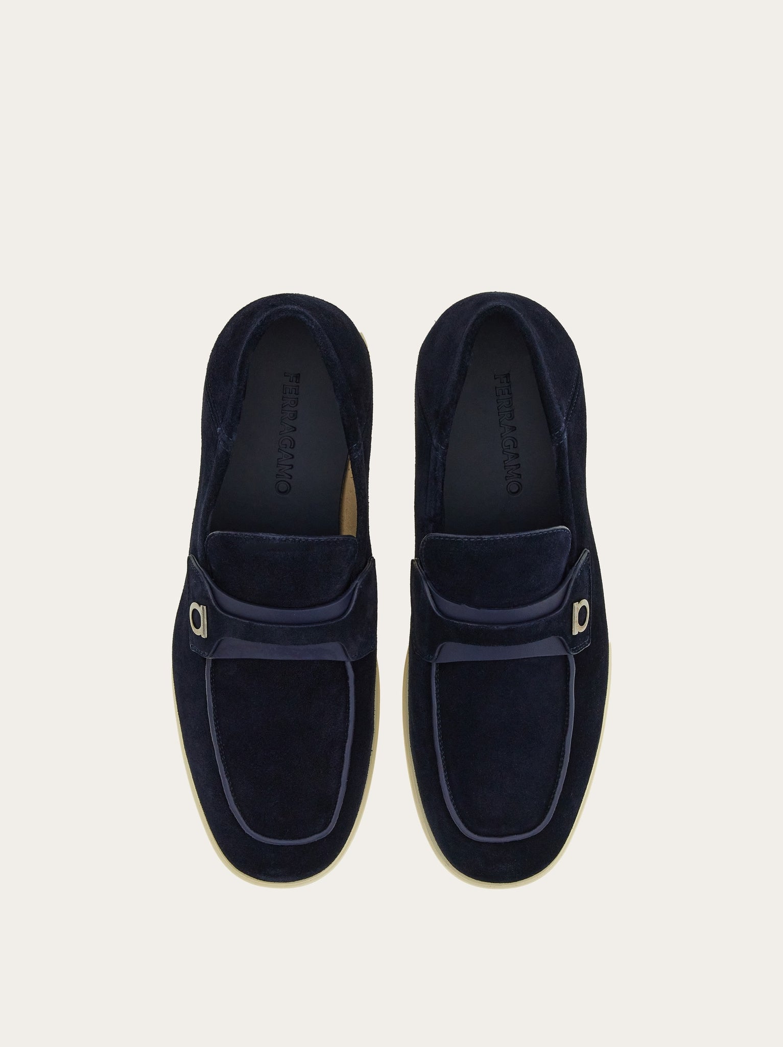 Casual and cool, with a luxurious feel, this soft Ferragamo loafer is made from Italian calfskin. The almond toe is complemented by a raw edged piping around the vamp to echo an off duty vibe. The double crossbar over the instep is punctuated by a small Gancini buckle with a titanium finish. Flexible white rubber sole.