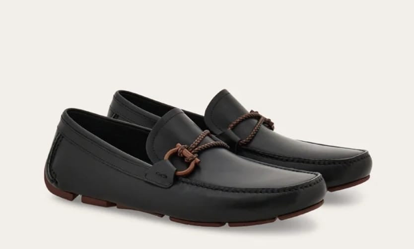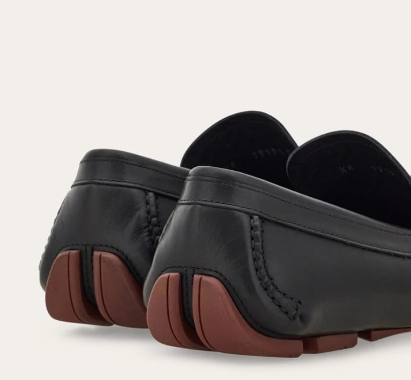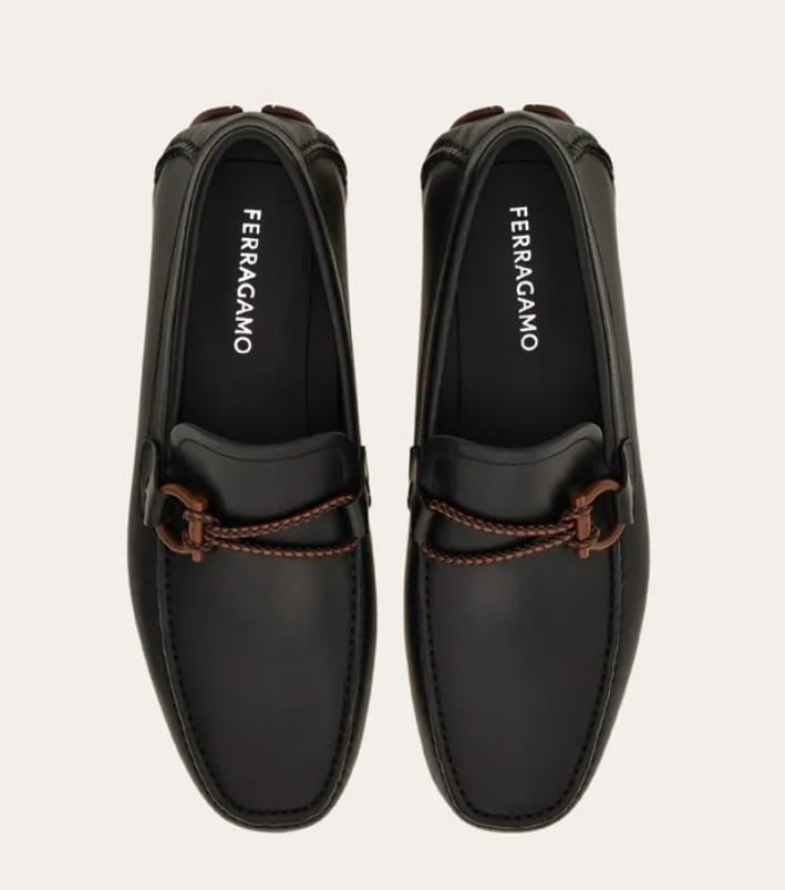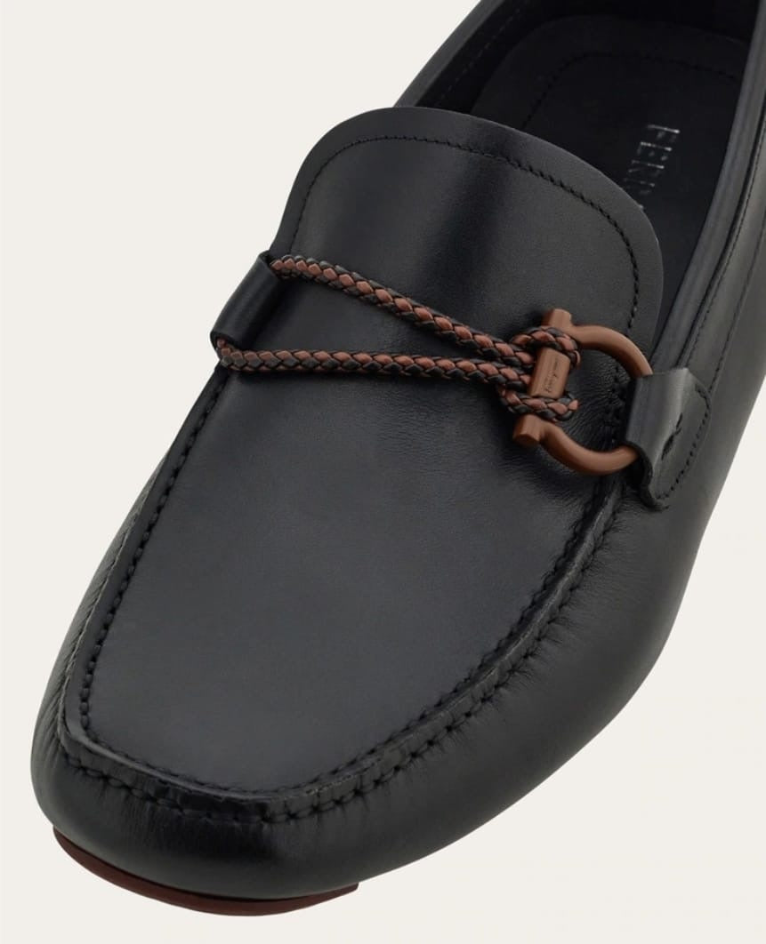 Casual yet refined, this driver loafer features a rounded profile with apron-toe seams and the signature Gancini buckle in a lacquered finish, enhanced by two-tone woven detailing. The rubber sole with a custom tread pattern ensures a dynamic stride. It's crafted using the tubular construction method, which involves meticulous hand-stitching and assembly, resulting in a flexible and lightweight silhouette.