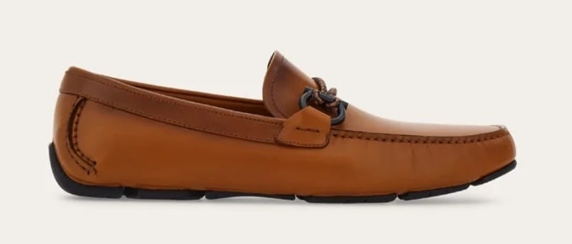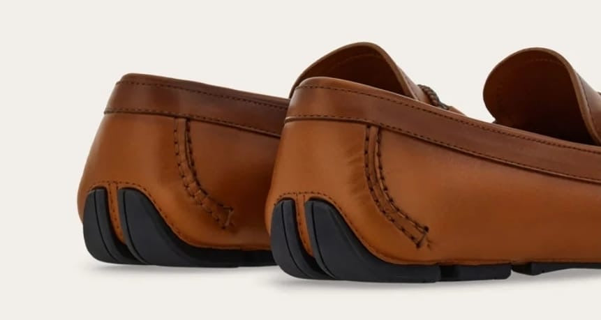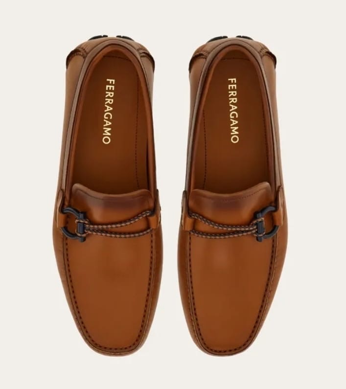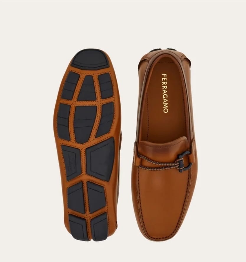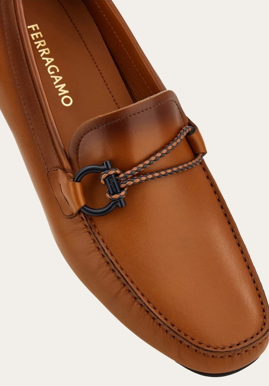 Casual yet refined, this driver loafer is made from supple calf leather, artisanally aged to create a rich, deep shade. The signature Gancini buckle in a lacquered finish is enriched with two-tone woven detailing, while the rubber sole with a custom tread pattern ensures a dynamic stride. It's crafted using the tubular construction method, which involves meticulous hand-stitching and assembly, resulting in a flexible and lightweight silhouette.