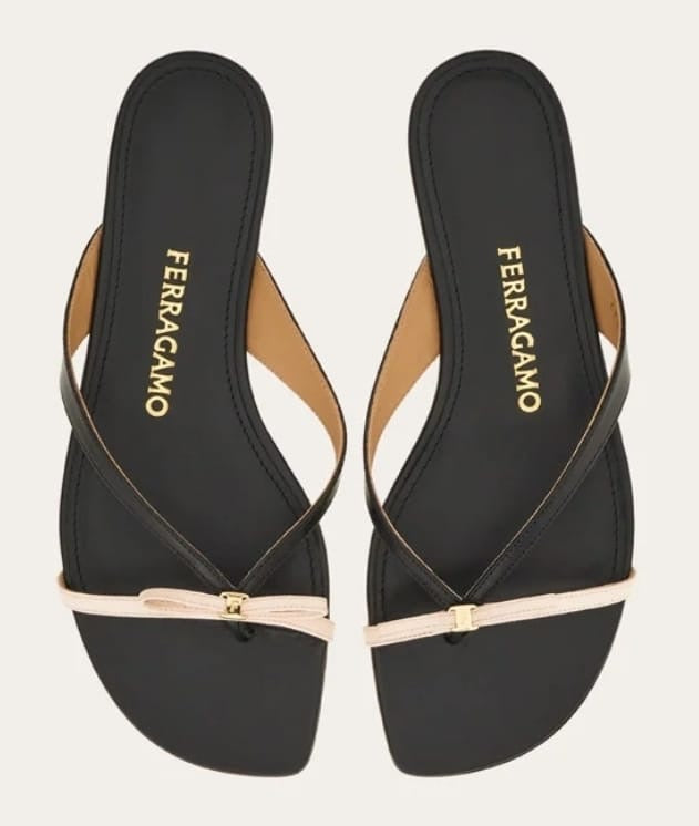 Two words: easy, chic. Topped with a contrasting bow with custom golden buckle, this elegant Ferragamo flip flop is crafted from super soft kid leather. Perfect for off duty ballerinas.