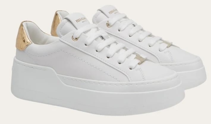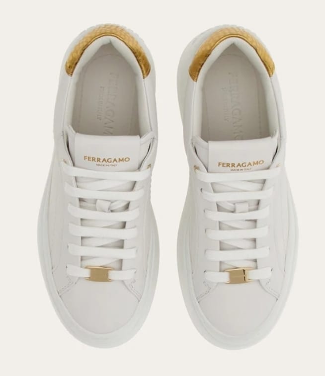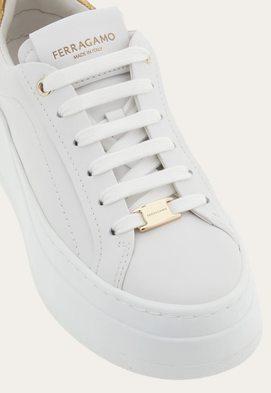 Nineties inspiration and clean lines define this new Ferragamo sneaker. The smooth calfskin upper features a reptile print strip with a golden finish for a touch of glam. A buckle runs through the laces, and the ultra-light rubber sole has a platform wedge with embossed signature. Leather insole.